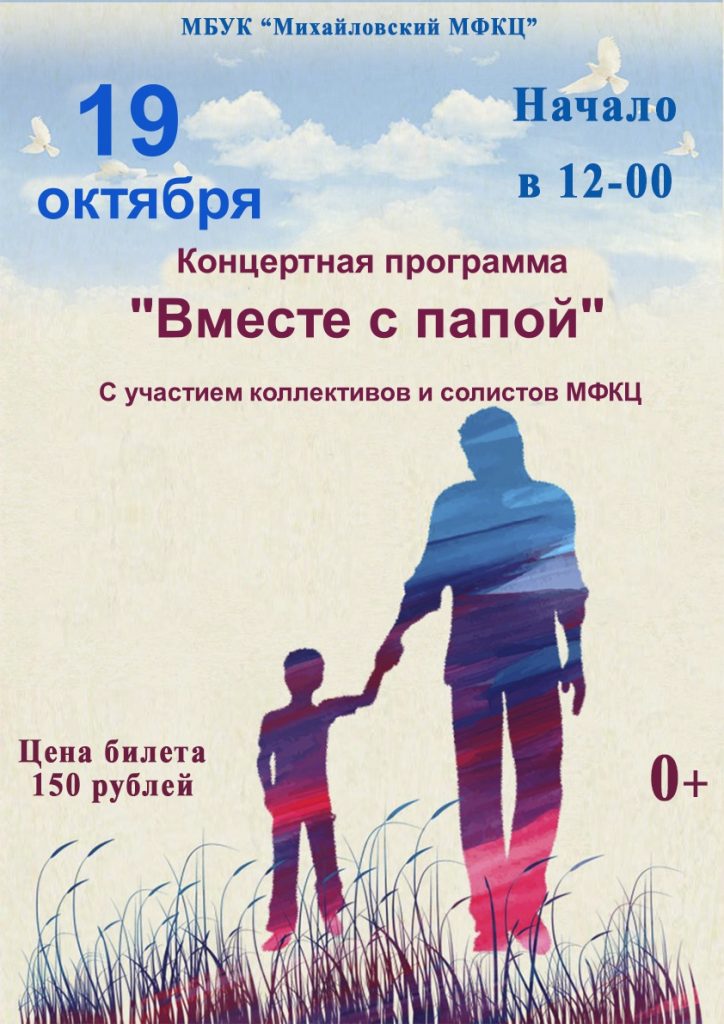 Дорогие друзья! Приглашаем вас на праздничную концертную программу «Вместе с папой», которая состоится 19 октября в 12:00 в МБУК «Михайловский МФКЦ». Этот теплый праздник посвящен самым сильным, надежным и любимым папам! Мы подготовили яркие творческие номера, которые подарят всем гостям прекрасное настроение!Немного истории: День отца – это праздник, призванный подчеркнуть важную роль отца в семье и […]