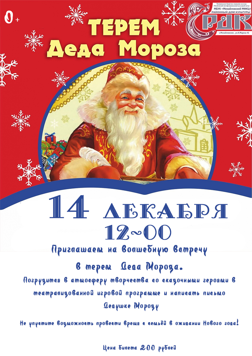 14 декабря волшебные врата ТЕРЕМА ДЕДА МОРОЗА распахнутся, приглашая вас в мир сказки!Окунитесь в атмосферу творчества и волшебства в компании любимых сказочных героев!Вас ждёт:Подарите своим детям незабываемые мгновения волшебства и ощущение прикосновения к чуду! Не забудьте прихватить с собой искренние улыбки и хорошее настроение! Дедушка Мороз с трепетом в сердце ждёт встречи с вами!